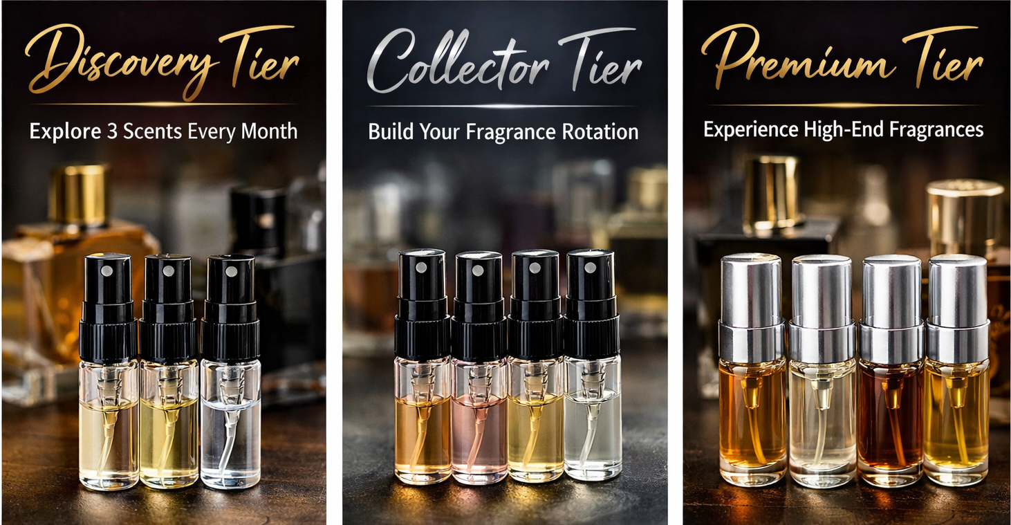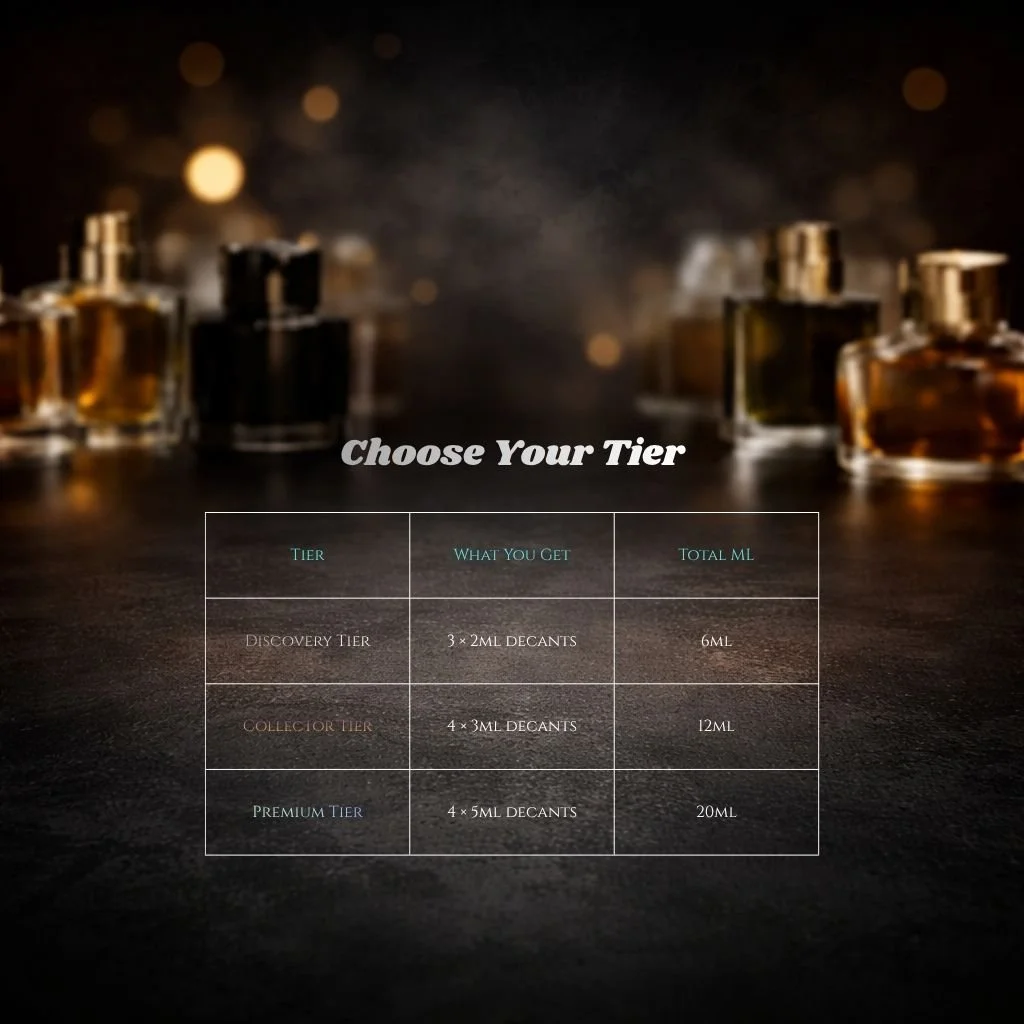 Instead of committing to one expensive bottle, get a curated rotation of high-quality scents delivered to your door every month. Whether you're just getting started or already building a collection, our subscription tiers are designed to help you discover, test, and wear a variety of fragrances without the risk.